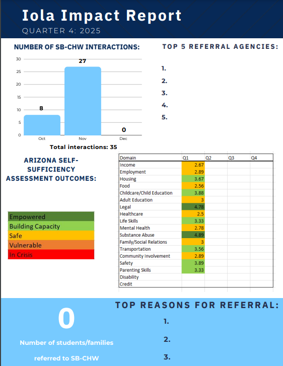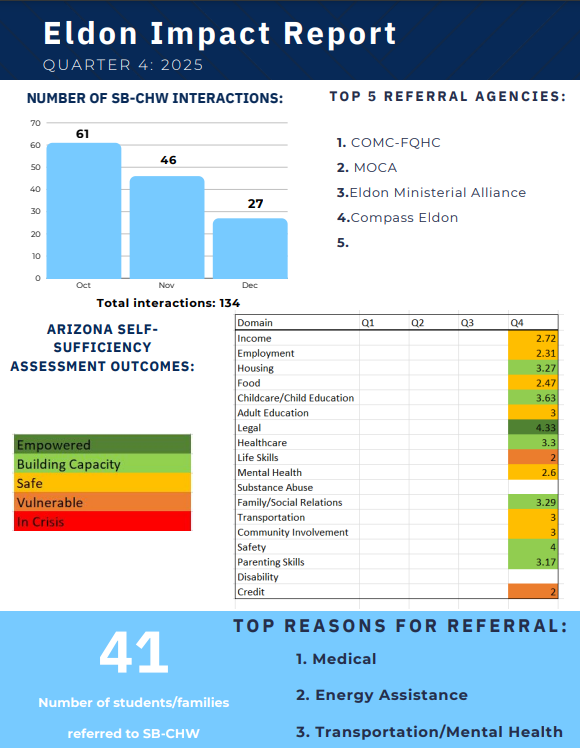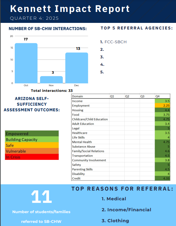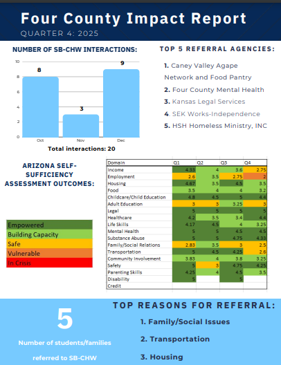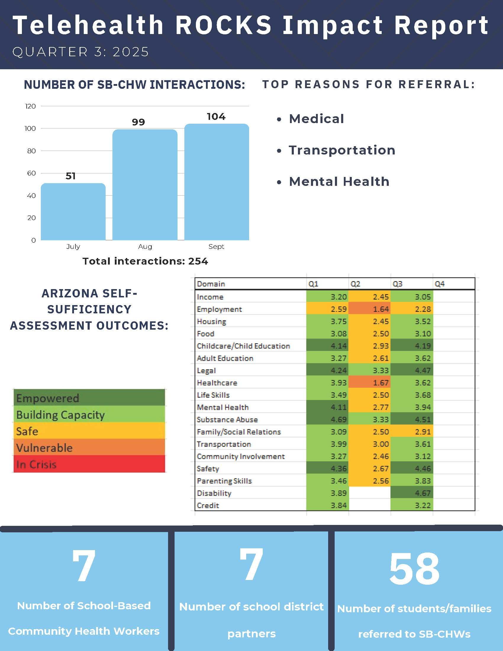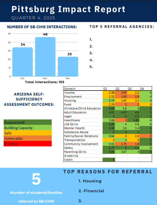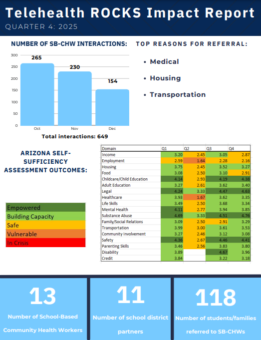 Telehealth ROCKS School-Based Community Health workers assess social determinants of health using the Arizona Self-Sufficiency Matrix, a validated tool to assess an individual or family’s progress over time across 18 domains.